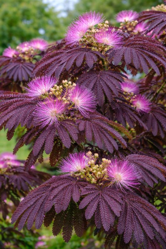 Albízia Summer chocolate, okrasná drevina s temno vínovými listami a krémovým až sýto ružovým guľovitým kvetenstvom s nápadnými tyčinkami